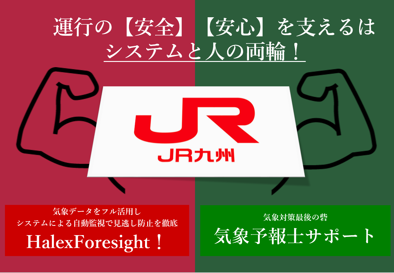 このたび、大荒れとなる気象現象が迫る際、より早期に的確な運行判断を行いたい!とのご要望を受け、当社防災サービスである「HalexForesight!」をご提案いたしました。予め路線や駅毎の気象リスク状況を捉えられるよう、路線毎に監視地点を設定し、独自の観測データと運行判断基準を反映。JR九州様向けのカスタマイズを実施しました。