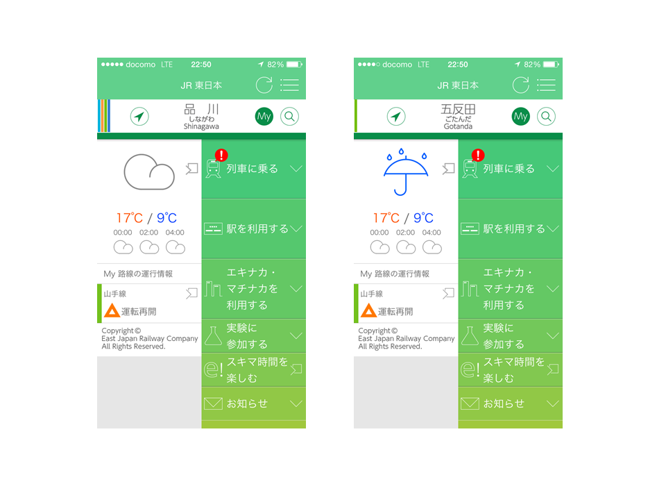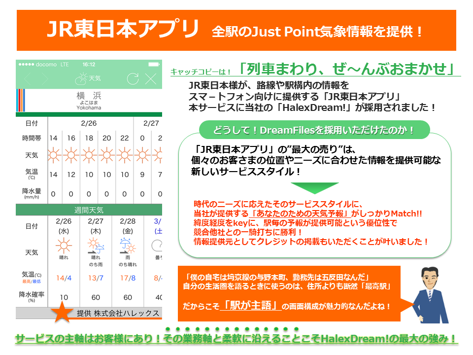 「JR東日本アプリ」では、JR東日本様が管轄する全駅について駅毎の天気予報をご活用いただけるということで、システム処理上も扱いやすいDreamFilesをお勧めしました。