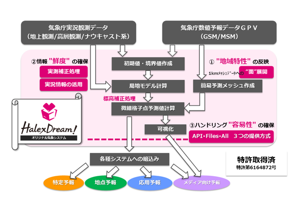 高精細データ加工技術HalexDream!では、気象庁から発表される実況観測データ・数値予報データ等あらゆるデータを取り込み、独自処理を行っています。 ①地域特性を反映し、1kmメッシュ格子毎の標高補正処理 ②情報の”鮮度”を確保するための、実況情報を活用した実測補正処理と1日48回のデータ更新 ③お客様側でのデータ処理の利便性を高めるために、パッケージ化して提供 (特許取得済:詳しくはこちらをご覧ください。) |