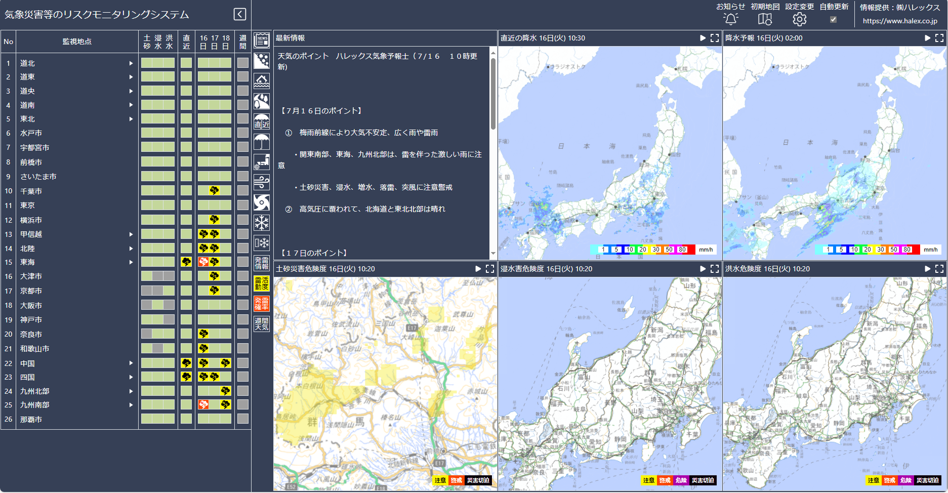 設定した監視地点に迫る気象災害リスクを、リストと地図で表示。 |