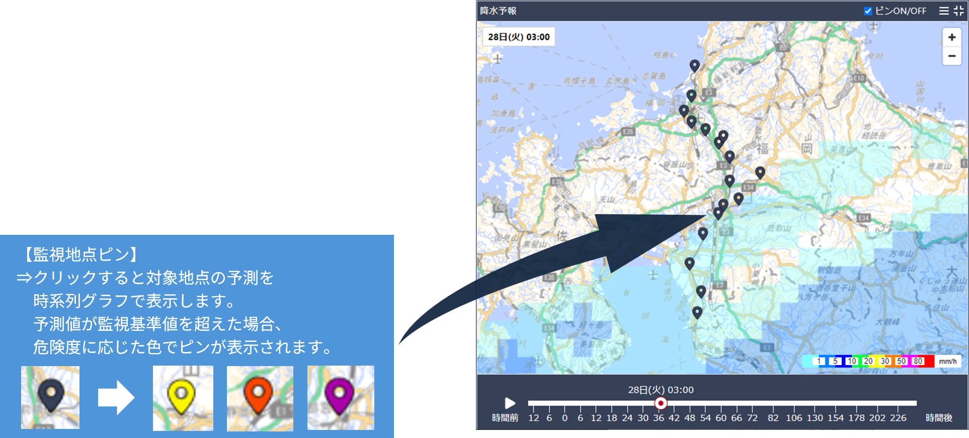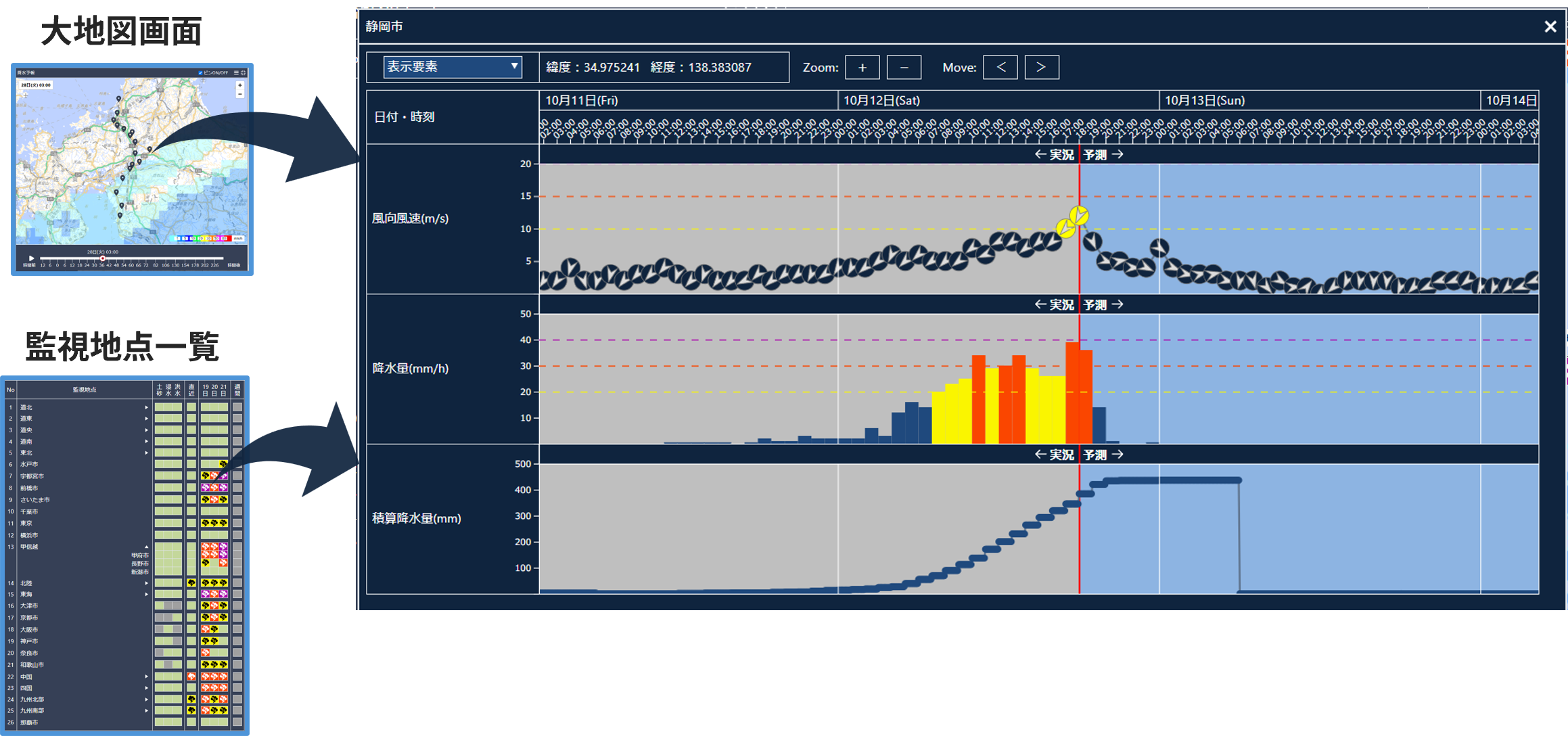 時系列ウィンドウ監視地点や地図上で選択した地点の気象災害リスク変化を時系列で確認できます。