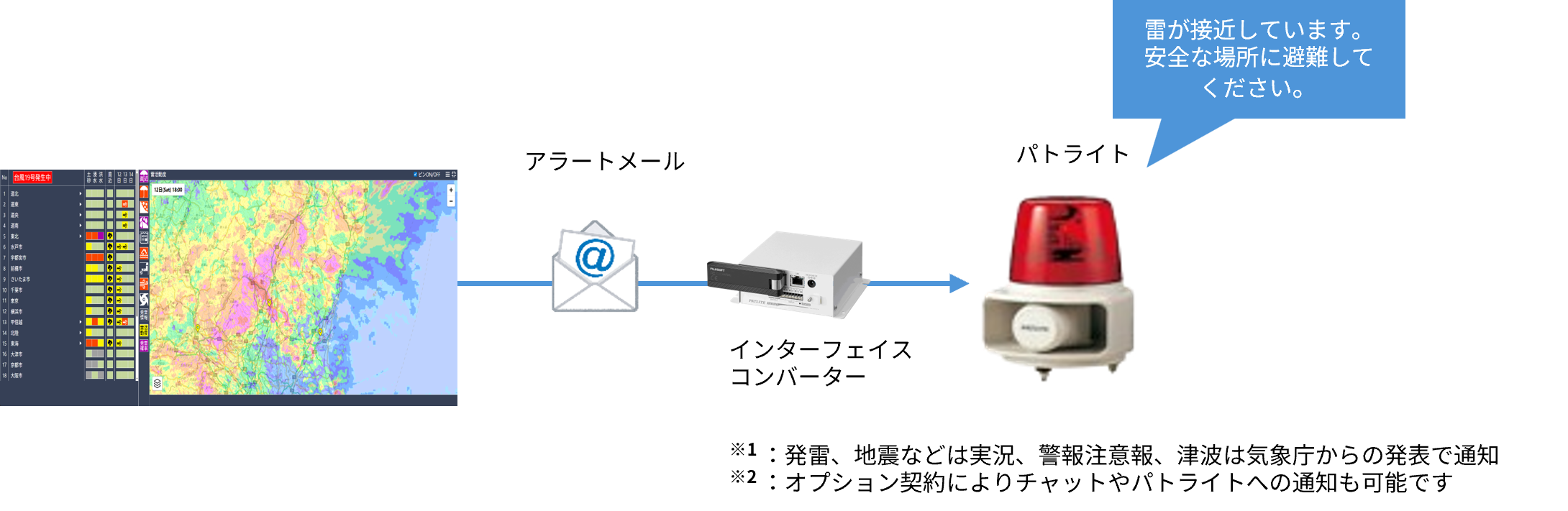 パトライト連携も可能!株式会社パトライト様の緊急補完システムと簡単に連携可能※2です。 この連携により、気象災害リスクを視覚化し、離れた現場にも迅速に通知できます。