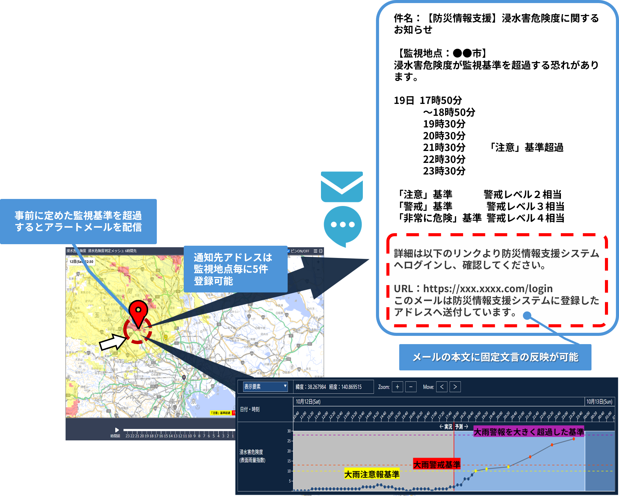 監視地点や地図上で選択した地点の気象災害リスク変化を時系列で確認できます。